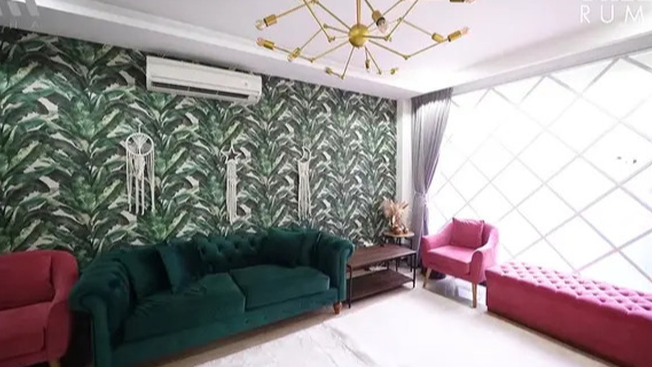 Q: Warna dominan yang dipakai? A: Warna yang mendominasi adalah hijau emerald, pink dusty, serta aksen emas, abu, dan putih. Kombinasi warna ini memberikan kesan segar dan elegan, menciptakan harmoni yang menyenangkan di dalam ruangan.