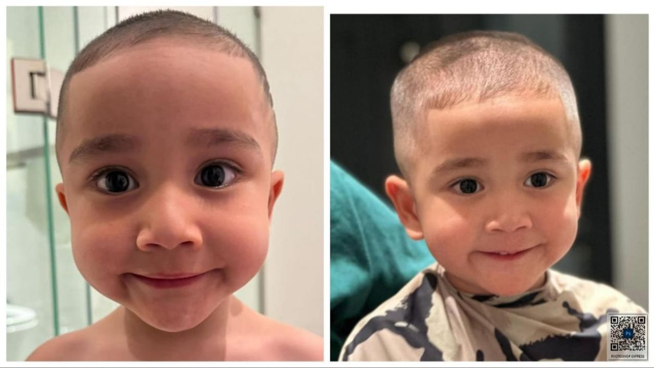 Bila biasanya Rayyanza selalu rewel saat potong rambut, kali ini tidak. Bocah berusia dua tahun itu anteng selama dipotong rambutnya.
