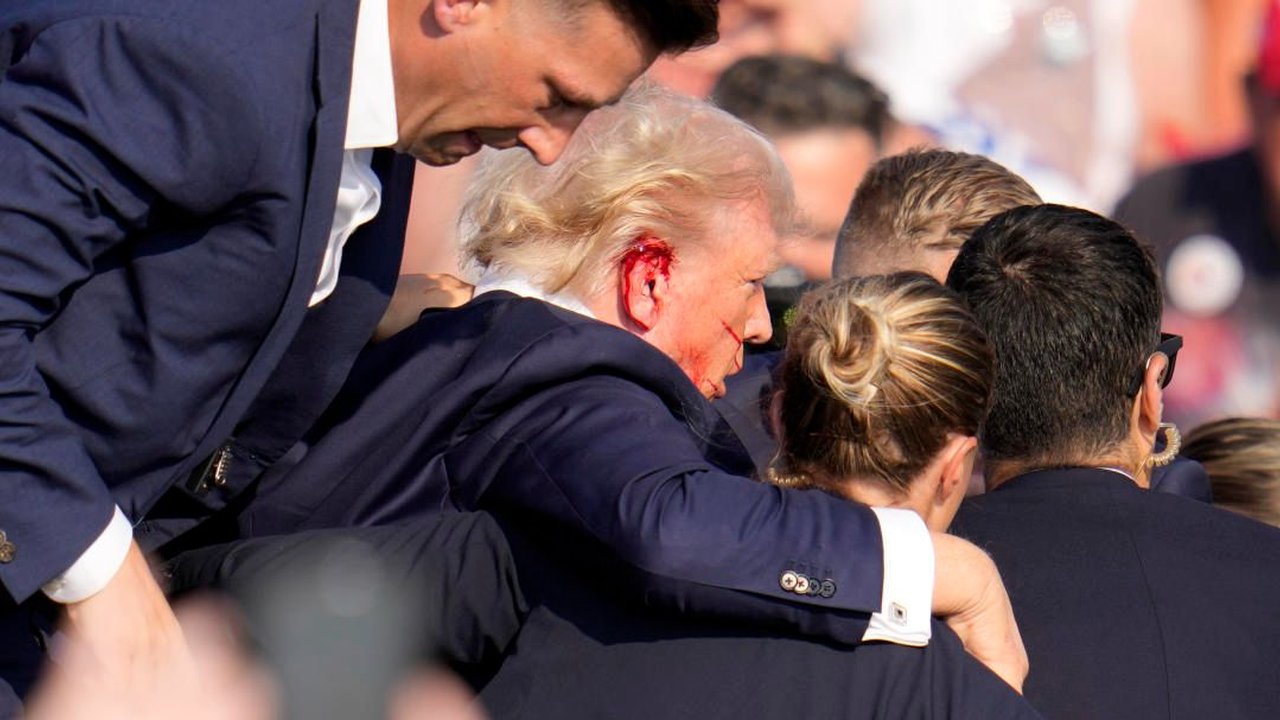 Mantan Presiden Amerika Serikat Donald Trump dilarikan dari panggung dengan darah di telinga dan wajahnya setelah ditembak saat sedang berpidato kampanye di Butler, Pennsylvania.