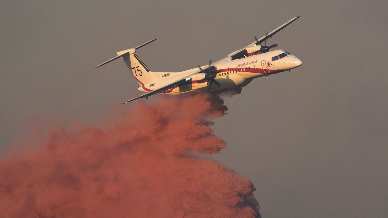 Sebuah pesawat pengebom air Canadair CL-415 dikerahkan untuk menjatuhkan air guna memadamkan kebakaran hutan yang terjadi di dekat Bizanet, Prancis selatan, pada Minggu (30/6/2025). Gelombang panas ekstrem dengan suhu di atas 40 derajat Celsius memicu kebakaran hutan di wilayah selatan dan barat daya Prancis.Lebih dari 400 hektare hutan dilaporkan hangus terbakar. Sekitar 100 orang dievakuasi dari wilayah terdampak, termasuk lokasi perkemahan dan sebuah biara. Api menyebar dengan cepat akibat kondisi vegetasi yang kering dan suhu tinggi, menciptakan kepulan asap hitam dan jingga tebal yang menyelimuti wilayah tersebut.