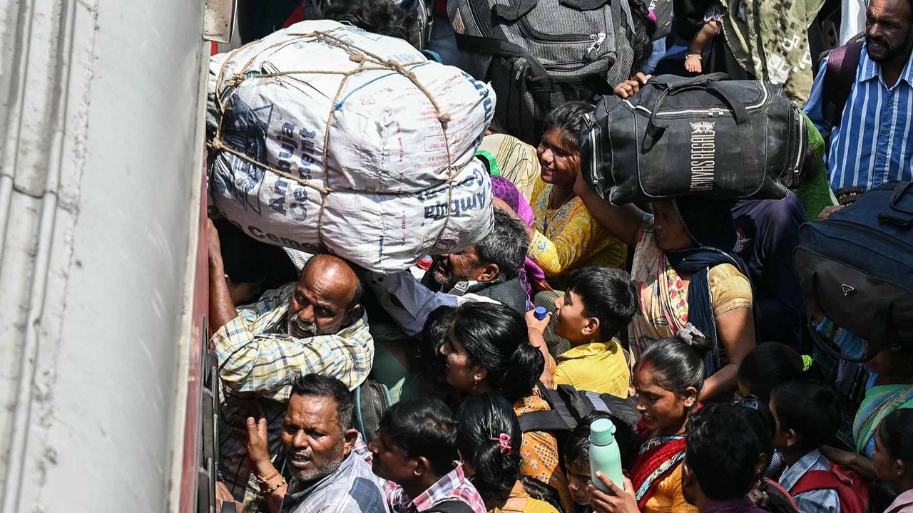 Warga berebut naik kereta kereta untuk mengungsi ke tempat yang aman di Stasiun Jammu Tawi di Jammu, India (10/05/2025). (AFP/ Money Sharma)