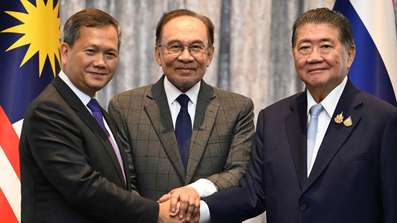 Perdana Menteri Kamboja Hun Manet (kiri) dan Penjabat Perdana Menteri Thailand Phumtham Wechayachai (kanan) berjabat tangan bersama Perdana Menteri Malaysia Anwar Ibrahim setelah perundingan perundingan gencatan senjata antara Thailand dan Kamboja di Putrajaya, Malaysia, Senin (28/07/2025). AP/ Pool/ Mohd Rasfan