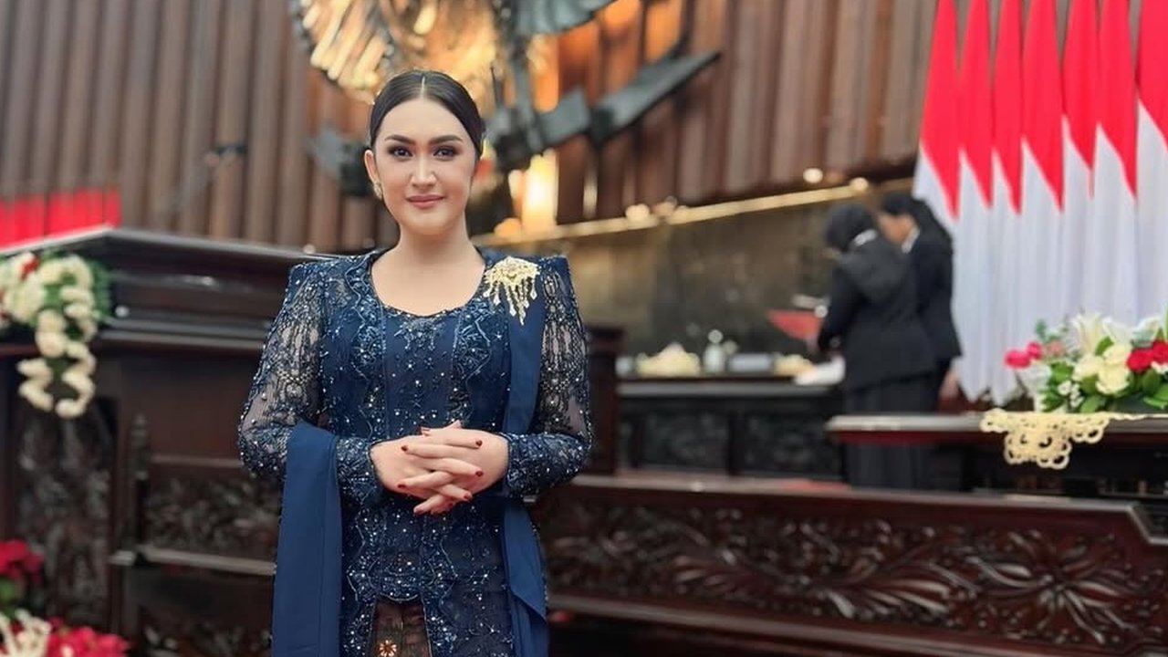 Kebaya modern berwarna biru tua yang ia kenakan dihiasi dengan detail brokat yang mewah serta payet berkilau. Kombinasi kebaya ini dengan kain batik berwarna cokelat emas menciptakan keseimbangan antara nilai tradisional dan keanggunan, sangat cocok untuk berbagai acara resmi, seperti sidang kenegaraan atau perayaan nasional. Aksen bros berwarna emas yang terletak di bahunya memberikan tambahan sentuhan glamor yang menawan.