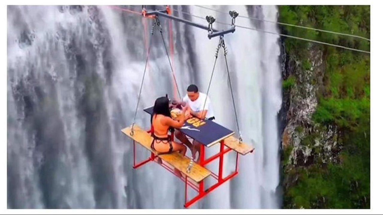 Tempat wisata ekstrem, menyediakan meja makan kayu yang menggantung di sisi air terjun yang tinggi.