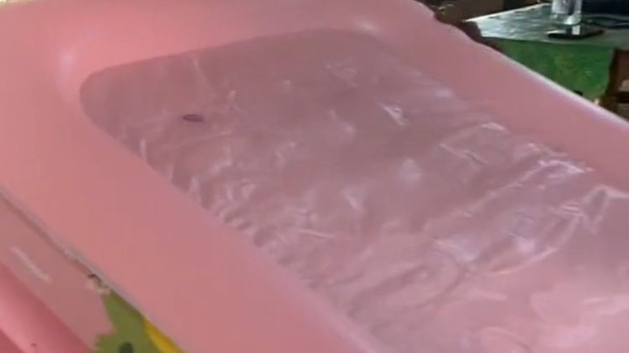 Awalnya, karena di rumah hanya ada pompa balon dan tidak sabar karena terlalu lama, ayahnya memutuskan untuk meniup sendiri kolam renang mainan ini. Semangatnya pun membuat semua orang tertawa.