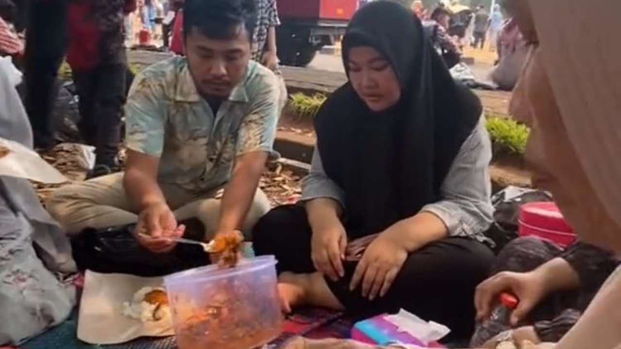Keluarga besar itu sampai menggelar tikar dan asyik makan bersama layaknya sedang piknik.