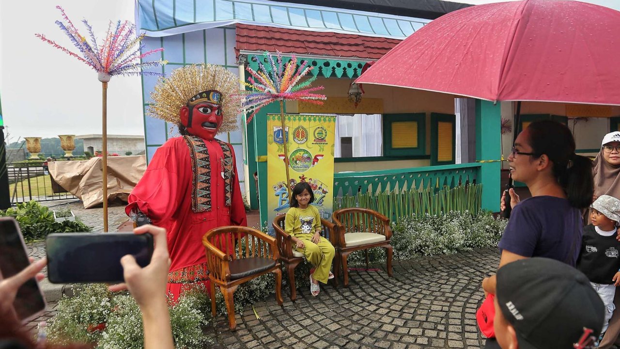 Seorang anak berfoto bersama Ondel-Ondel yang menghiasi area perayaan Lebaran Betawi 2025 di lapangan Monumen Nasional (Monas), Jakarta, Sabtu (26/4/2025). (Liputan6.com/Angga Yuniar)