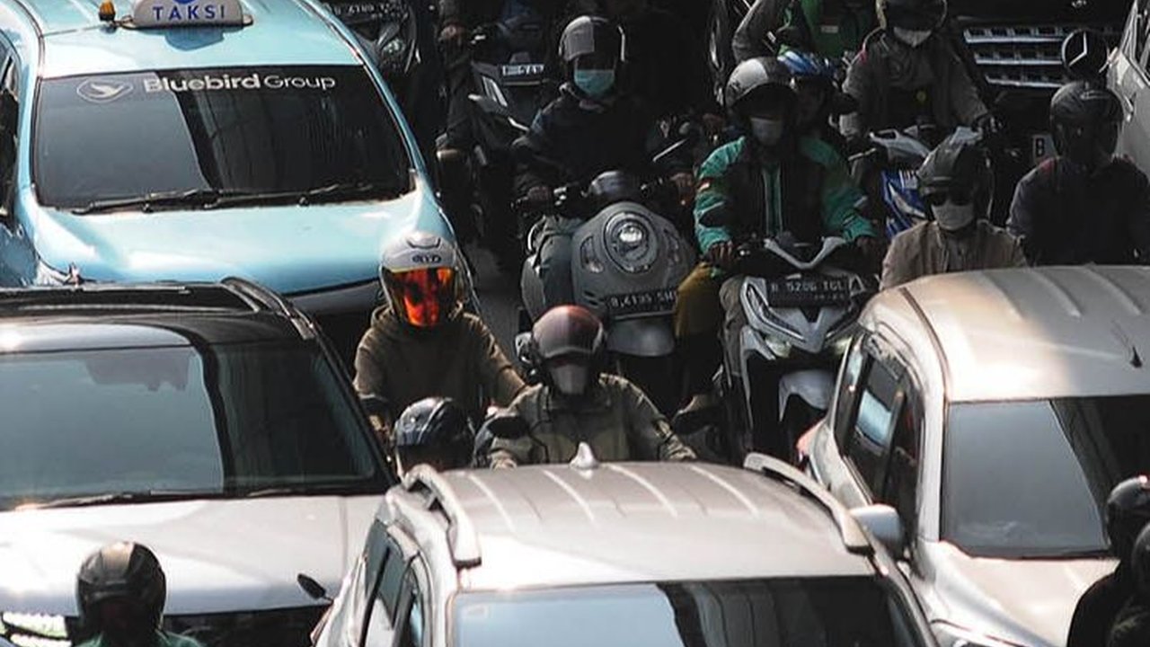 Suasana kemacetan lalu lintas di salah satu ruas jalan di Jakarta ketika orang-orang berangkat kerja, pada Rabu (8/11/2023).