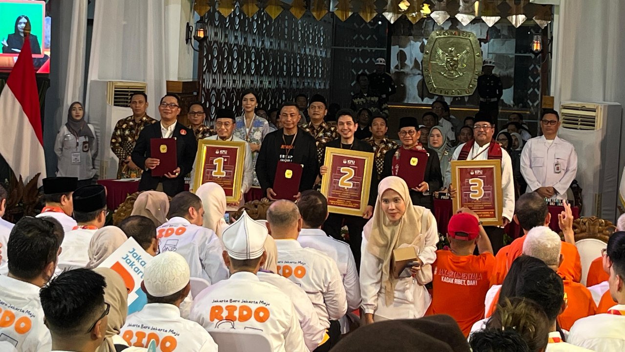Hasilnya, pasangan Ridwan Kamil-Suswono mendapatkan nomor urut 1. Sedangkan, pasangan Dharma Pongrekun-Kun Wardhana mendapatkan nomor urut 2. Sementara, pasangan Pramono Anung - Rano Karno mendapatkan nomor urut 3.