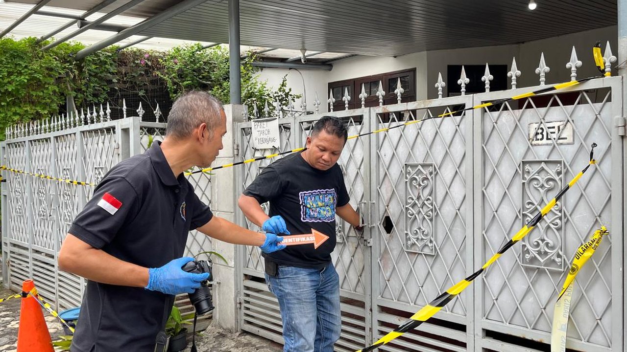 Garis polisi atau police line terpasang terpasang di area depan pagar rumah. Sementara itu, beberapa anggota polisi berpakaian preman.