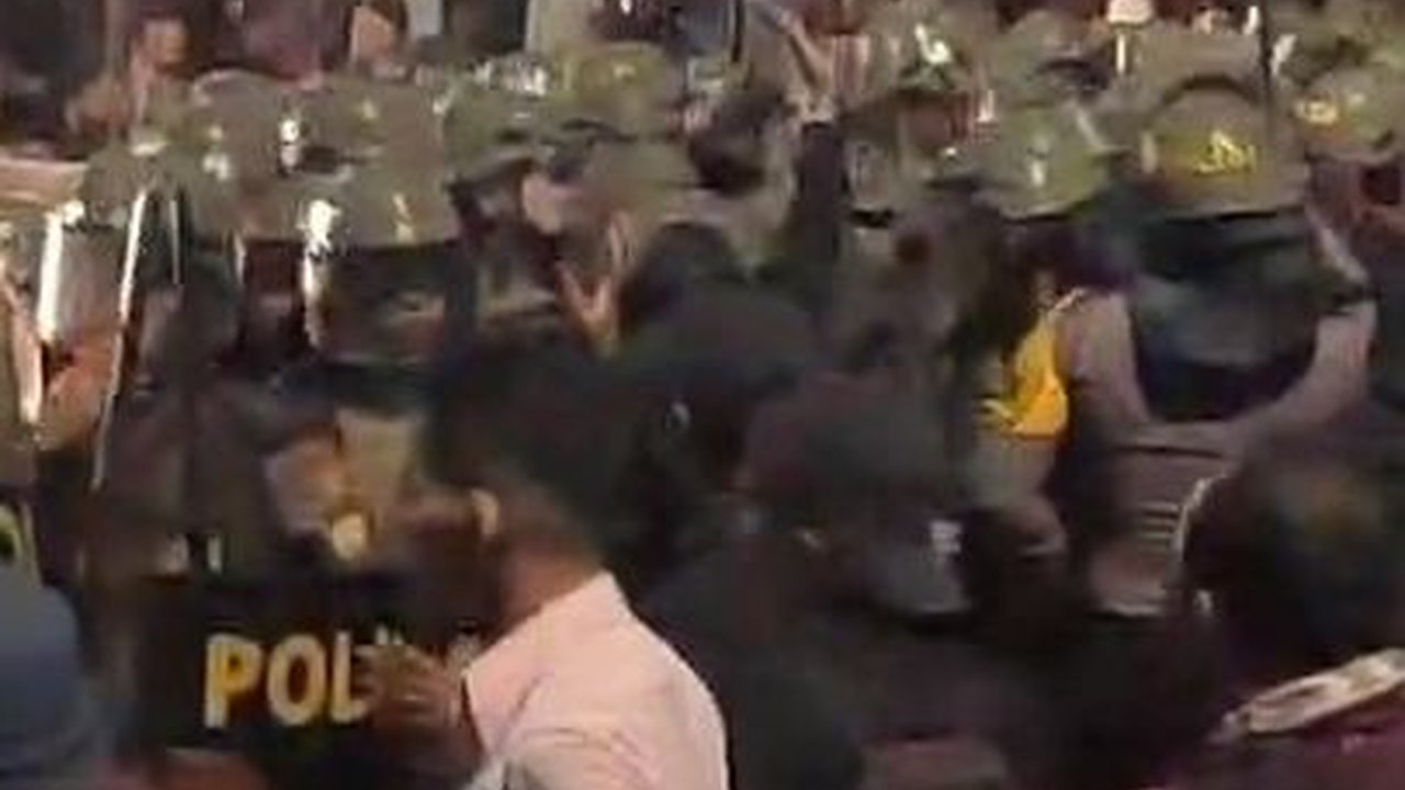 "Cukup-cukup, rapatkan barisan. Semua tenang-tenang," ucap salah satu aparat kepolisian.