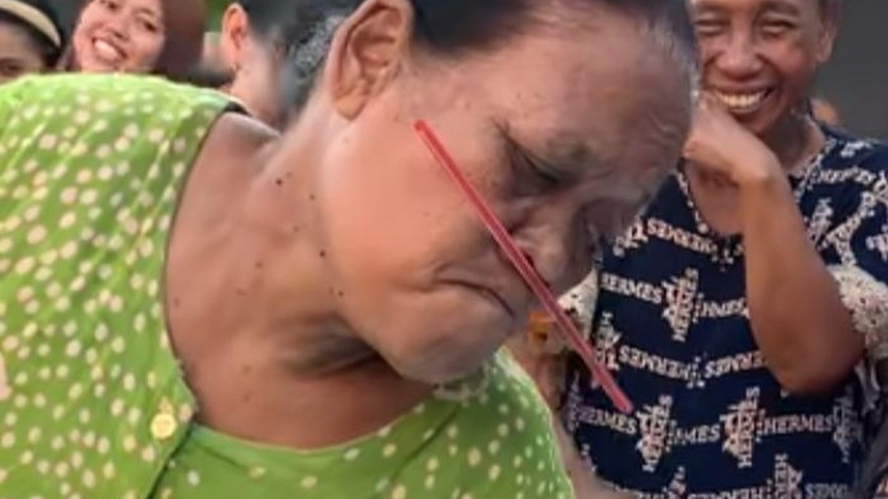 Aksi emak-emak saat 17-an ini juga mencuri perhatian. Tampak permainan meniup lilin dengan memakai stoking di kepala. Emak-emak kaos merah ini tampak kesulitan saat meniup lilin. Alhasil ia pun gagal dalam perlombaan ini. Raut wajahnya berhasil mengundang tawa warganet.