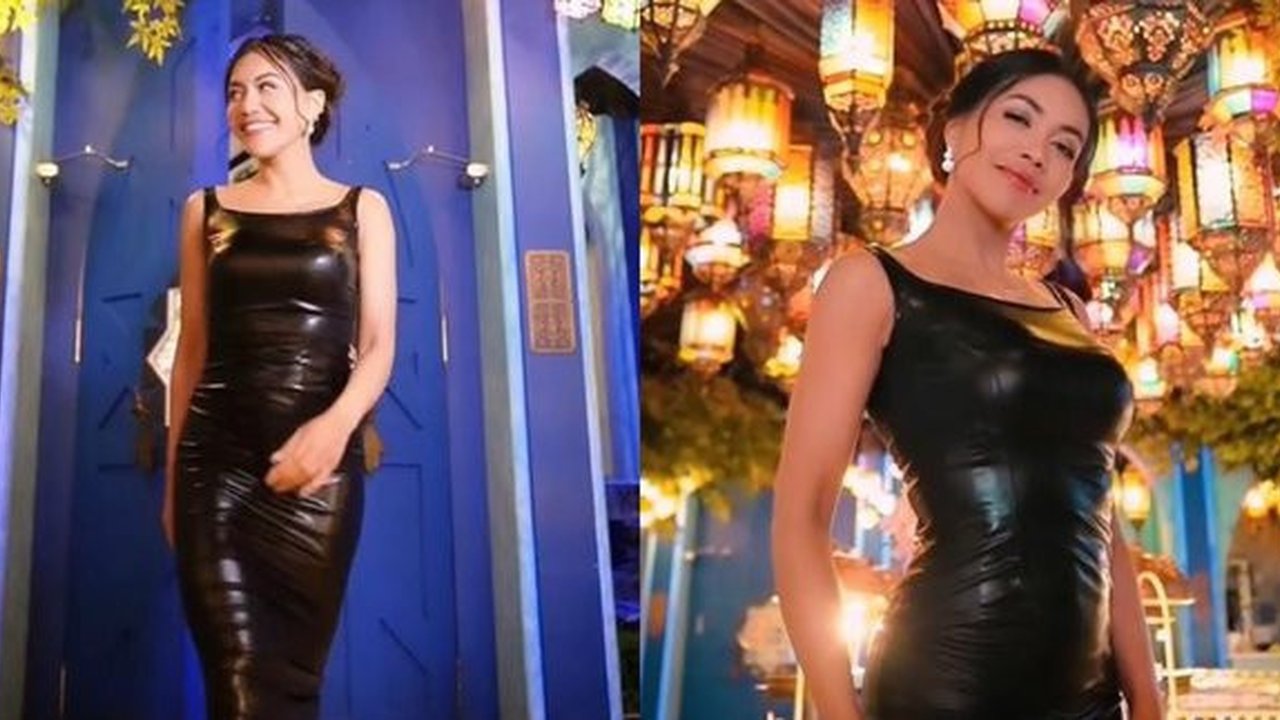 Bahan glossy pada dress ini menciptakan efek pantulan cahaya yang dramatis, terutama saat ia berpose di bawah lampu-lampu berwarna cerah. Desain tanpa lengan dan potongan neckline yang sederhana semakin menegaskan nuansa glamor tanpa terkesan berlebihan.