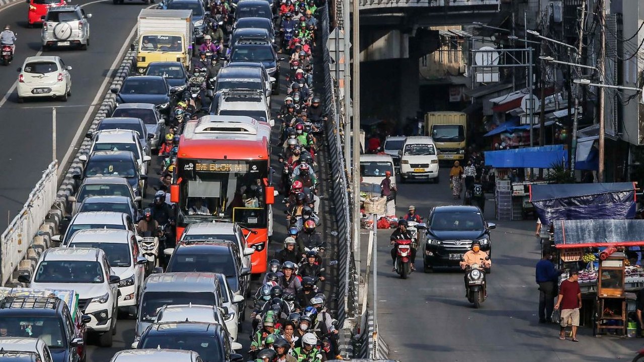 Kondisi macet yang berhenti total membuat sebagian orang merasa tidak sabar dan memilih menyerobot lajur berlawanan. Tampak sebuah mobil hitam diikuti beberapa mobil lain memilih melawan arah agar bisa segera berjalan.