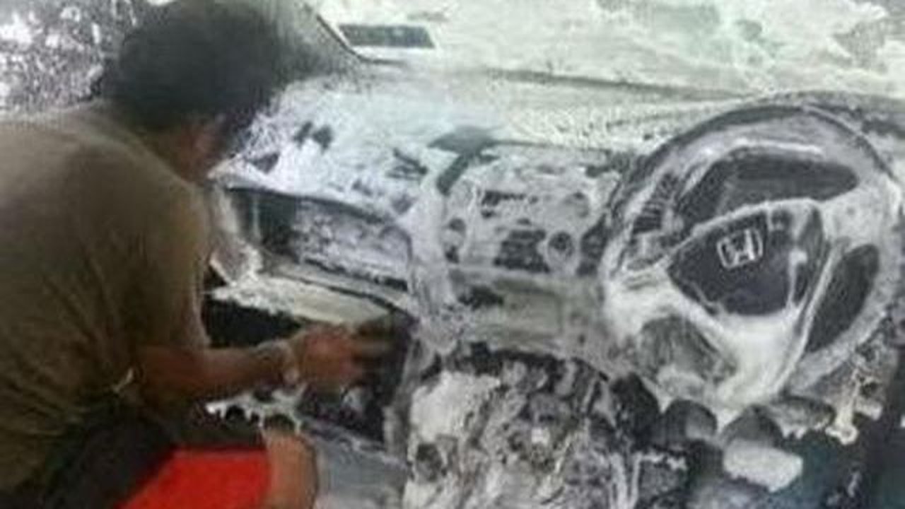 Meskipun sebenarnya bagian interior mobil harus dibersihkan juga, pria ini dengan sembarangan mencuci interior mobil dengan sabun yang bisa merusak lapisannya. Akibatnya, mobil menjadi rusak.