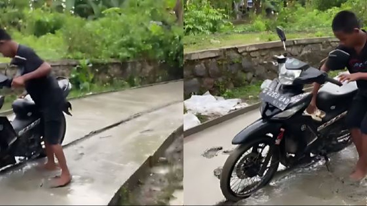 Motor Dua Pemuda Nekat Melintasi Jalan Baru yang Dicor, Hasilnya Motor Rusak!
