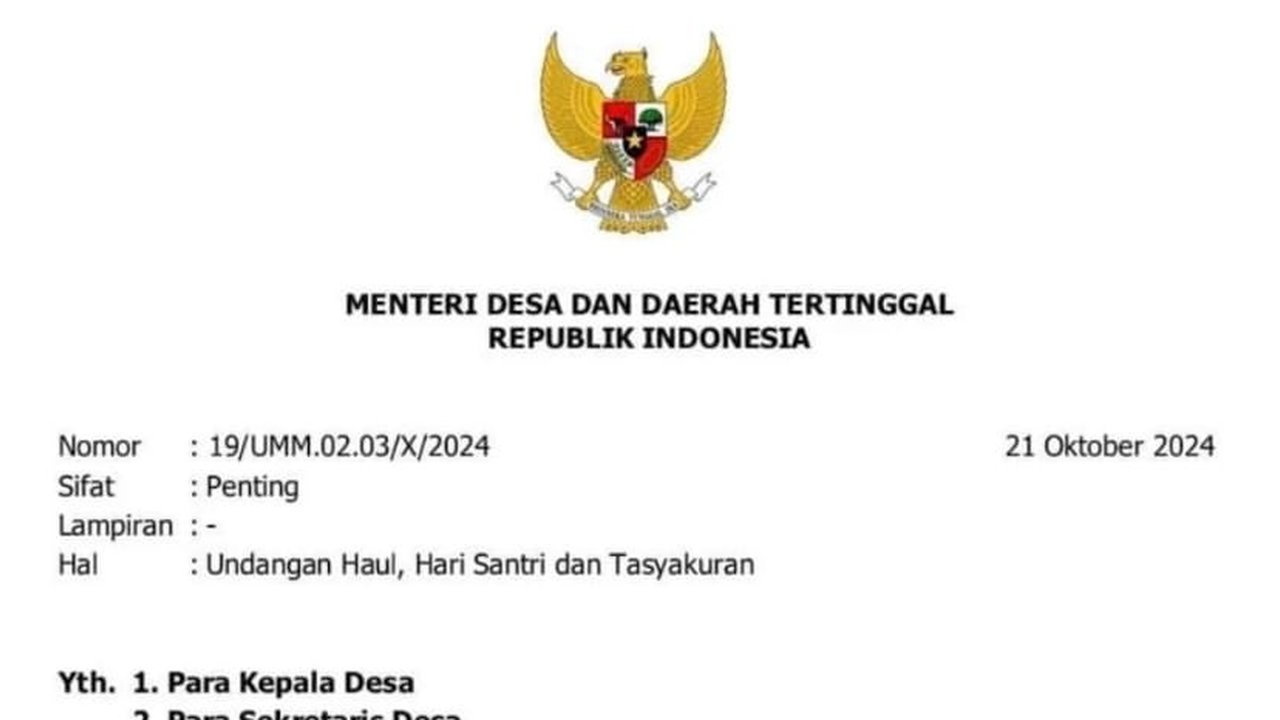 Berdasarkan gambar yang diterima Selasa (22/10), undangan Kemendes itu bernomor 19/UMM.02.03/X/2024 dan bersifat penting. Surat undangan itu ditandatangani Mendes Yandri Susanto pada 21 Oktober 2024.