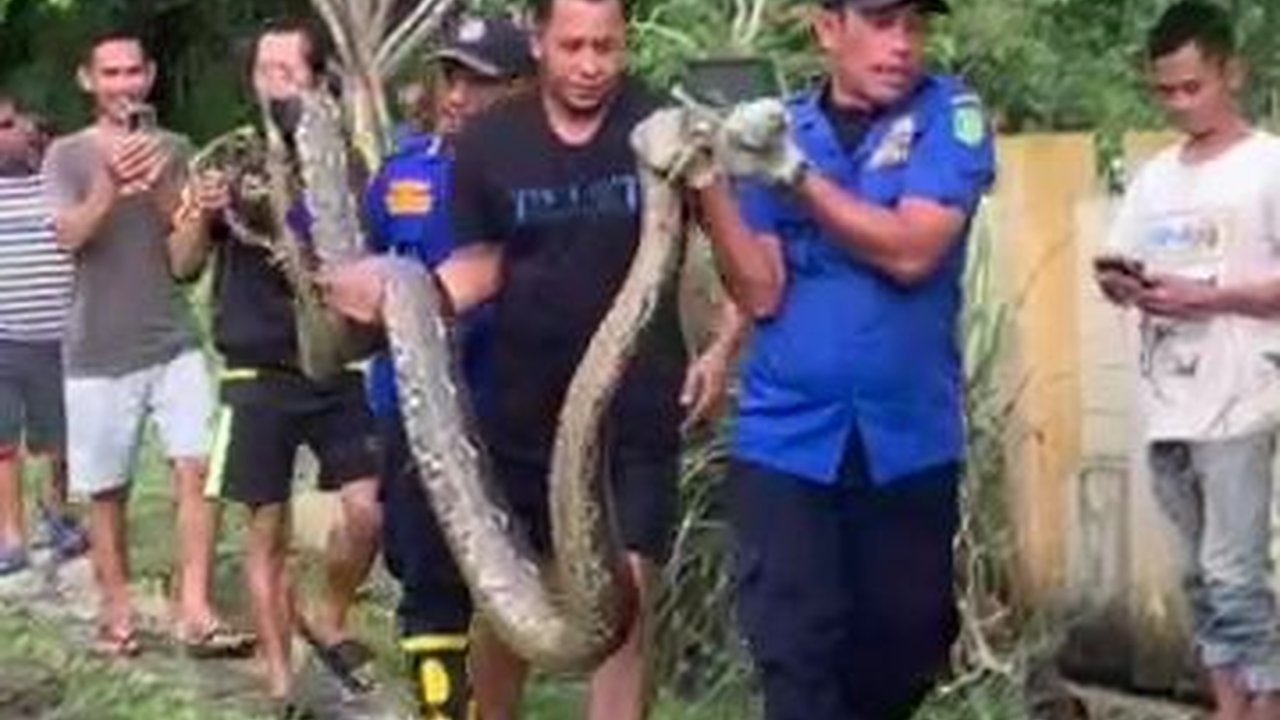 Dalam video, terlihat 5 orang pria menggotong ular piton itu keluar dari permukiman. Tiga orang berbaju dinas Damkar dibantu 1 orang warga mengevakuasi ular yang disebut baru memangsa seekor kambing.
