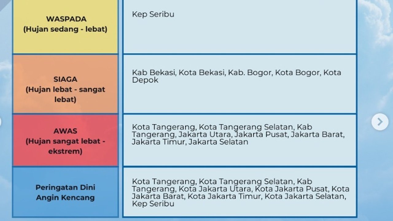 "Untuk di level SIAGA potensi wilayah terdampak adalah Kabupaten Bekasi, Kota Bekasi, Bogor dan Depok," demikian dikutip akun instagram @BMKG, Jumat (23/1).