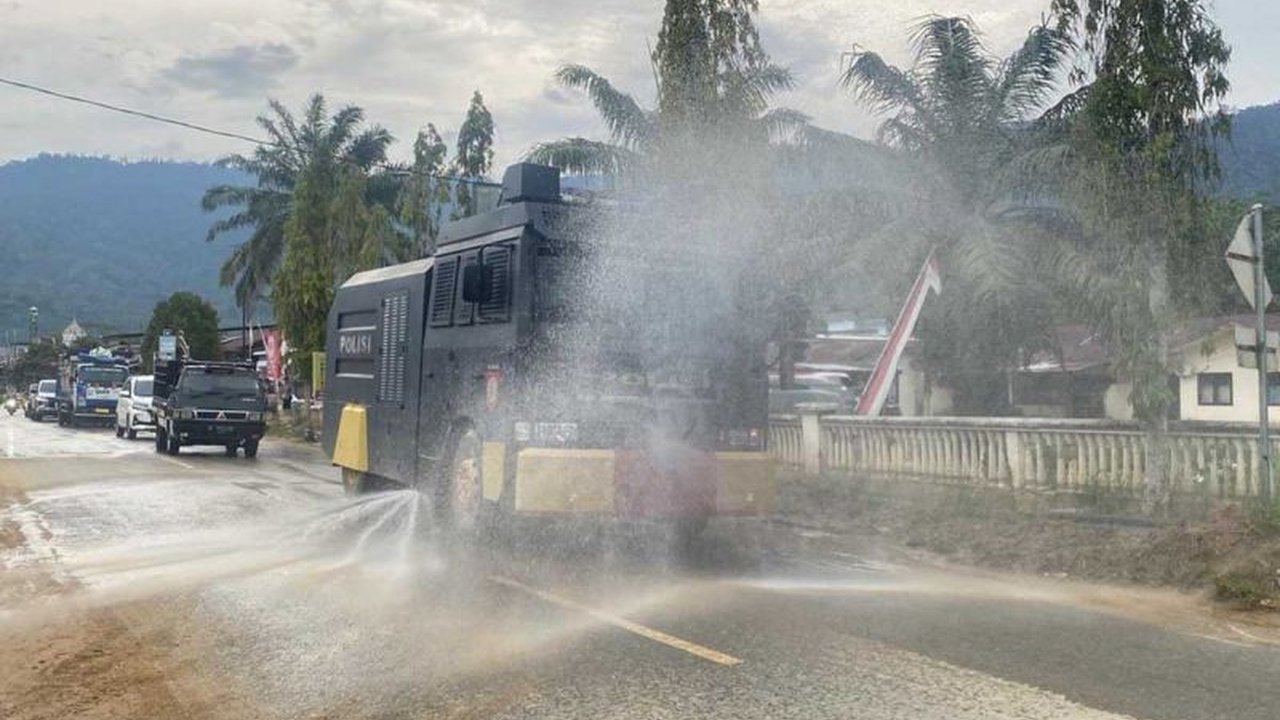 Polres Aceh Selatan Bersihkan Debu Banjir pasca-musim penghujan menggunakan water cannon di jalan protokol. Langkah ini diambil untuk mencegah ISPA dan menjaga kesehatan warga.
