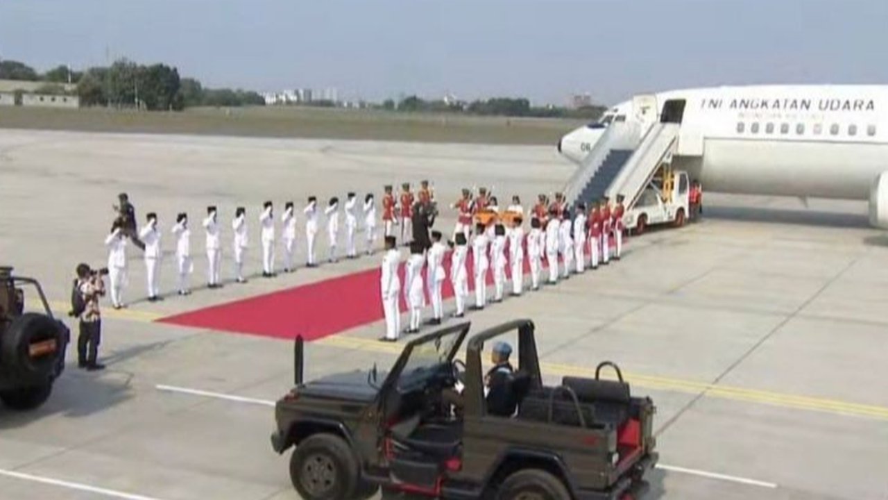 Duplikat bendera pusaka merah putih dan naskah teks proklamasi tiba di Bandara Halim Perdanakusuma, Jakarta, setelah dikirab dari Istana Negara IKN untuk dikembalikan ke tempat penyimpanan di Monumen Nasional (Monas) Jakarta.