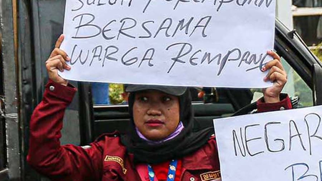 Mereka mengangkat tinggi-tinggi poster berisi tuntutan untuk Pulau Rempang.