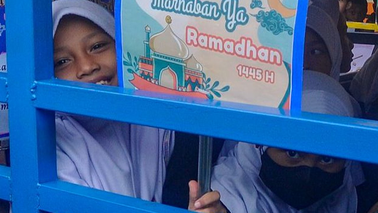 Murid SDI Al Hidayah menunjukkan poster 'Marhaban ya Ramadan' saat mengikuti pawai tarhib Ramadan dengan menaiki odong-odong di kawasan Cinere, Depok, Jumat (8/3/2024). Merdeka.com/Arie Basuki