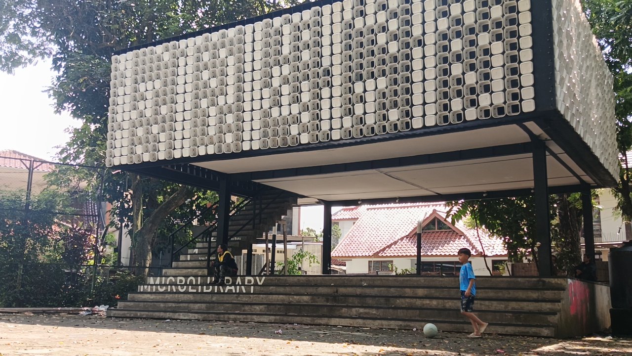 Di Jalan Bima, Kelurahan Arjuna, Kecamatan Cicendo, Kota Bandung, berdiri sebuah bangunan mencolok dengan tampilan tak biasa. Dindingnya disusun dari ember bekas es krim, membentuk pola menyerupai jendela simbol bahwa buku adalah jendela dunia.