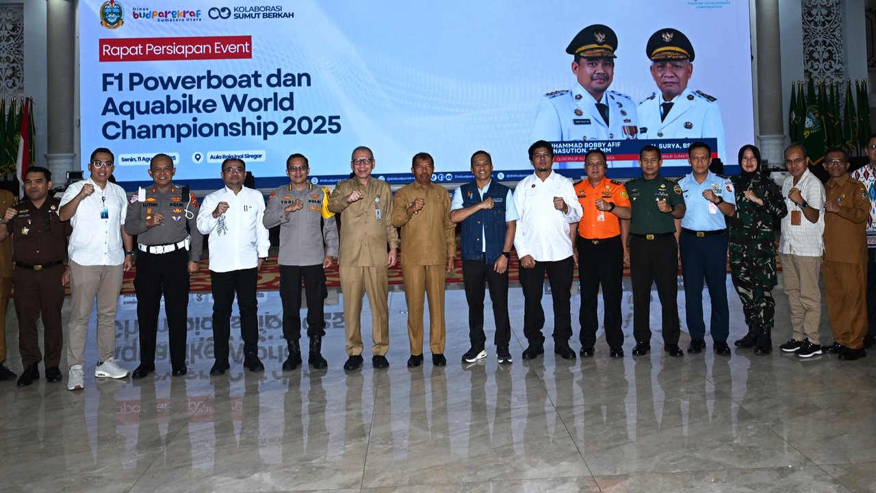 "Pemprov mendukung penuh penyelenggaraan event internasional ini, apalagi kita tahu dampak positif event ini kan besar, dari tahun ke tahun baik," kata Sekdaprov Sumut, Togap Simangunsong saat rapat koordinasi persiapan Aquabike Jetski World Championship dan F1 Powerboat di Aula Raja Inal Siregar, Kantor Gubernur, Jalan Diponegoro 30 Medan, Senin (11/8/2025).