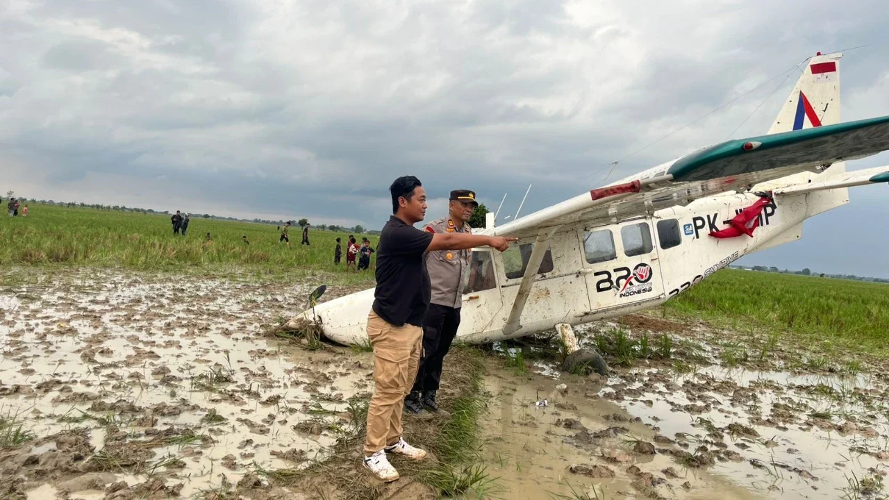 Diduga karena ada gangguan teknis berupa loss power, pesawat tersebut terpaksa mendarat darurat di atas pematang sawah.