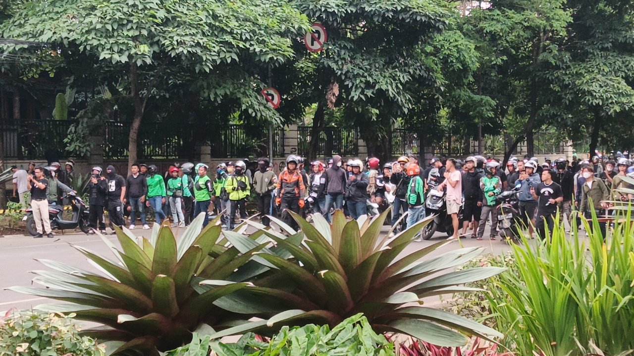 Sementara itu, di depan Gedung Sate tampak sekitar 100 orang massa dengan mayoritas mengenakan jaket ojek online.