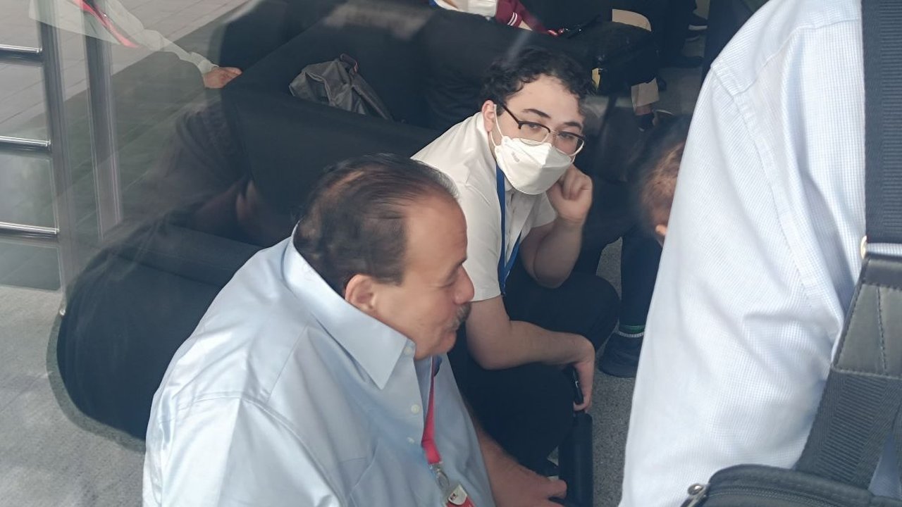 Dia kemudian duduk di kursi merah untuk menunggu giliran diperiksa oleh penyidik.