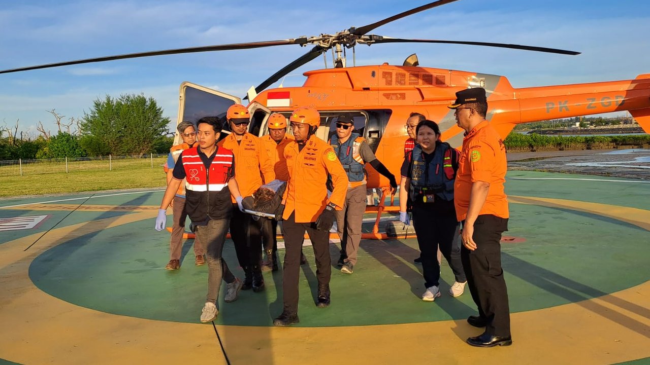 Kepala Kantor SAR Denpasar I Nyoman Sidakarya menerangkan helikopter mendarat di helipad SGi Air Bali dengan membawa total lima orang, terdiri atas dua kru helikopter, satu dokter, korban, dan satu pendamping korban.