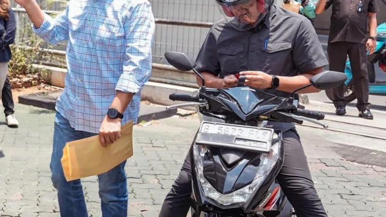 Anies menumpangi motor matic untuk datang ke Loket Pelayanan Masyarakat Baintelkam Polri di Cilandak