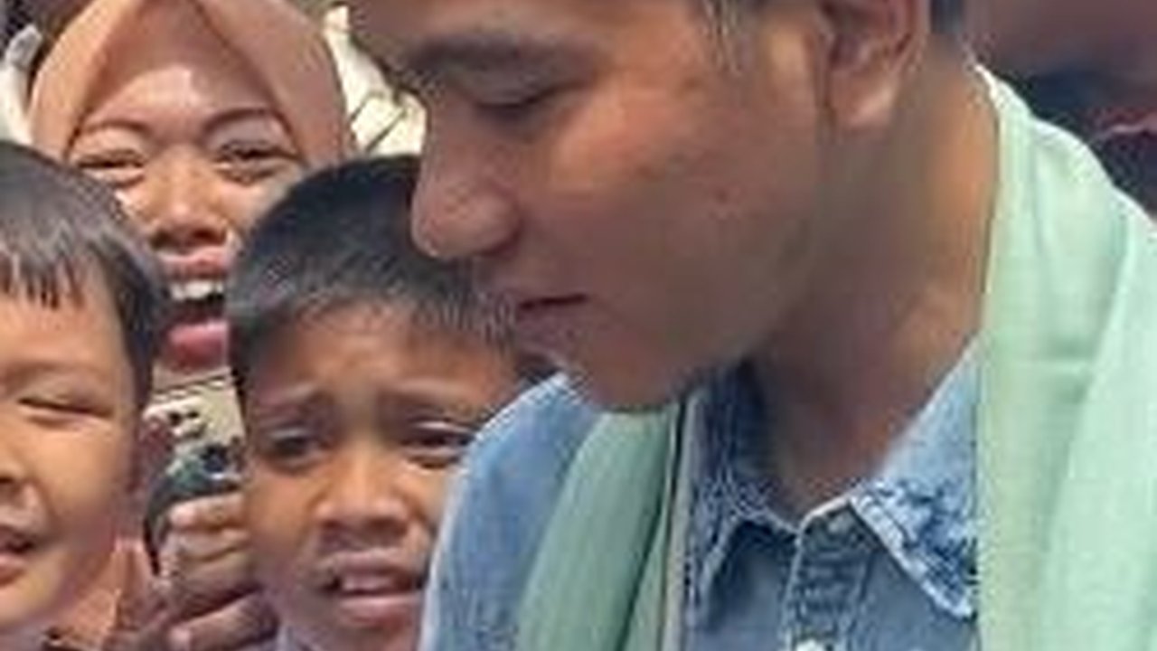 Kakak kandung Kaesang Pangarep ini tampak menyalami warga satu persatu. Sambil salaman, Gibran juga membagikan buku tulis kepada anak-anak dan warga.