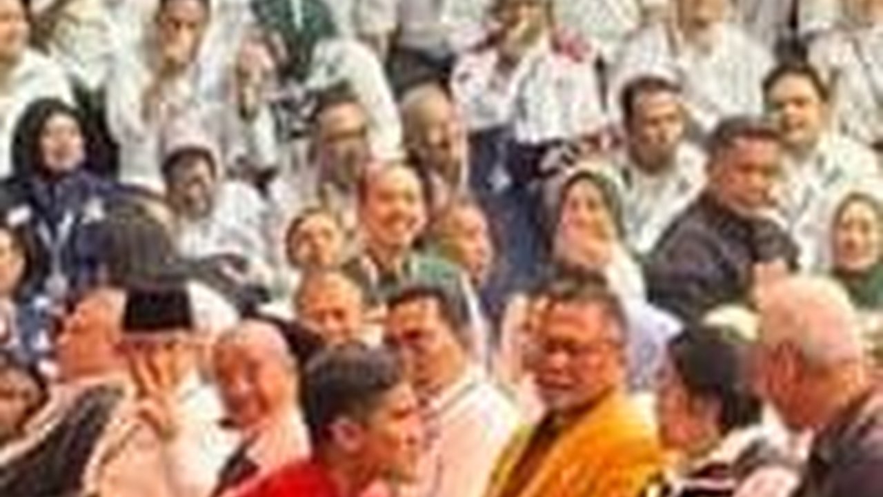 Terlihat juga, cawapres Koalisi Indonesia Maju (KIM) Gibran Rakabuming Raka yang mendampingi Prabowo Subianto untuk mengambil nomor urut.