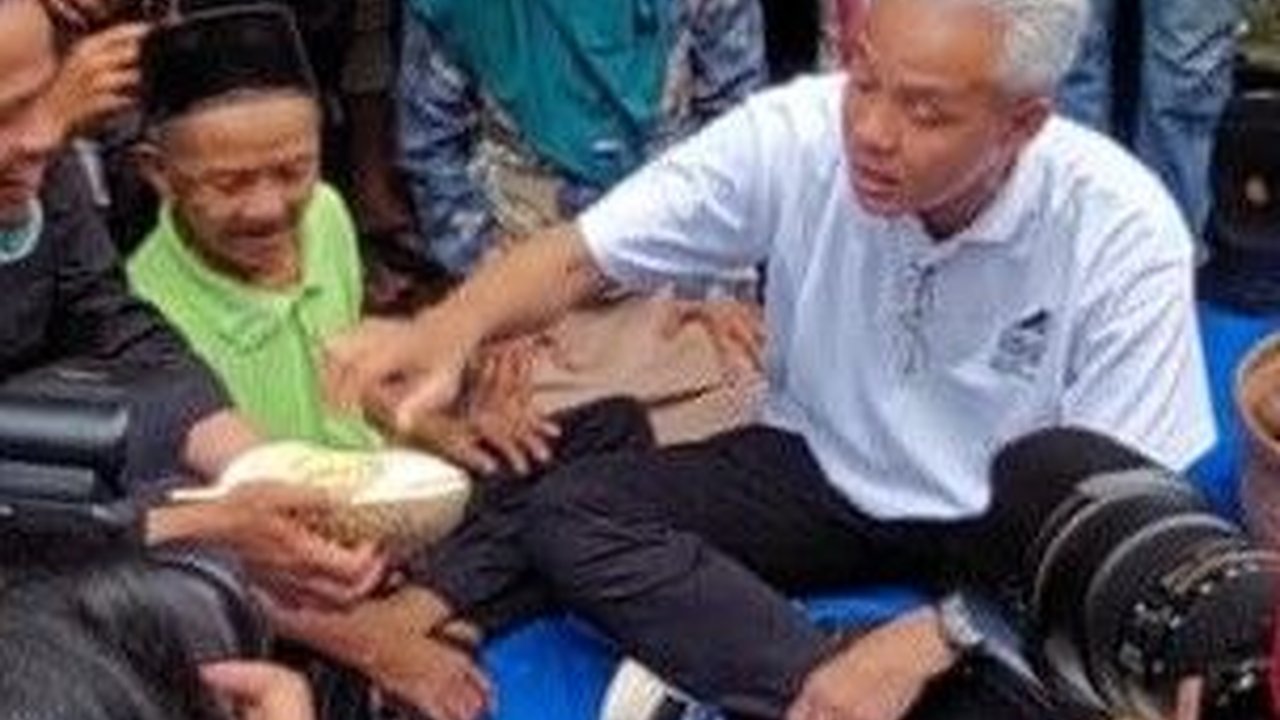 Saat Ganjar asik memakan durian, ada ibu-ibu mengenakan baju putih dan kerudung hitam tiba-tiba melempar pertanyaan yang membuat suasana riuh.