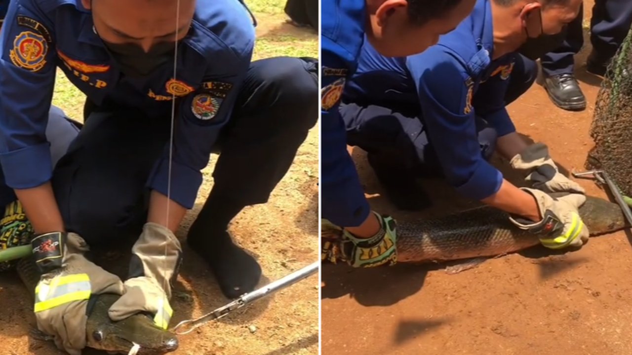 Akhirnya, usaha petugas damkar membuahkan hasil. Ikan aligator besar itu berhasil ditangkap setelah kail pancing tersangkut di mulut ikan.
