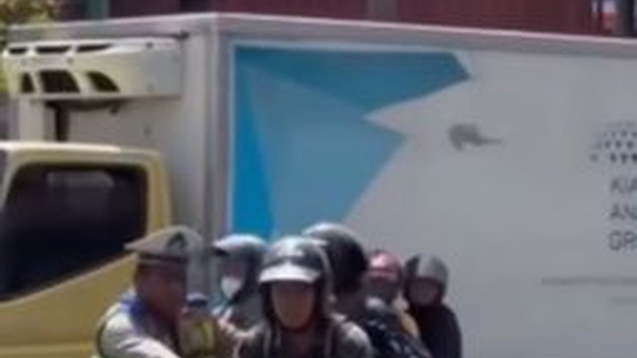 Melalui video tersebut, petugas nampak berusaha memberhentikan salah satu kendaraan dengan dua pria di atasnya. Namun, aksi petugas justru mendapat penolakan.