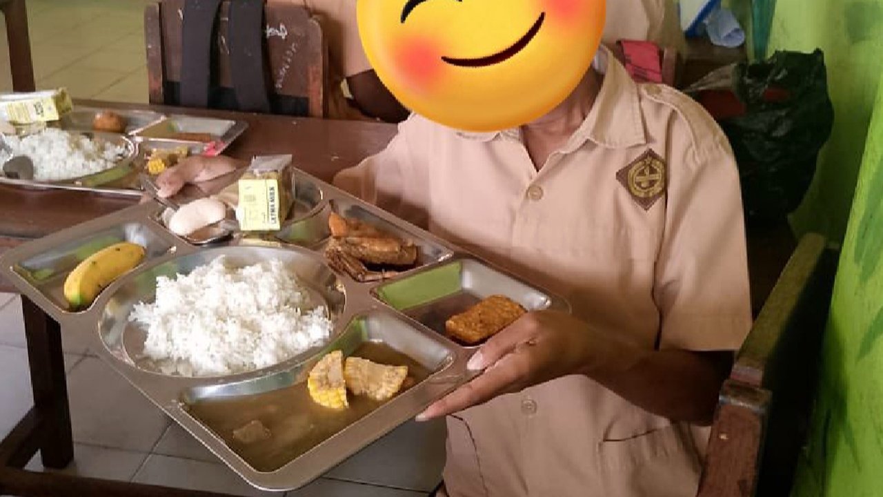 Selanjutnya, pada postingan akun Beby berikutnya menampilkan siswa SMPN 3 Jayapura tengah memegang MBG. Berbeda pada unggahan sebelumnya, kali ini menu MBG itu ada nasi dengan lauk ayam, tempe, sayur asam.