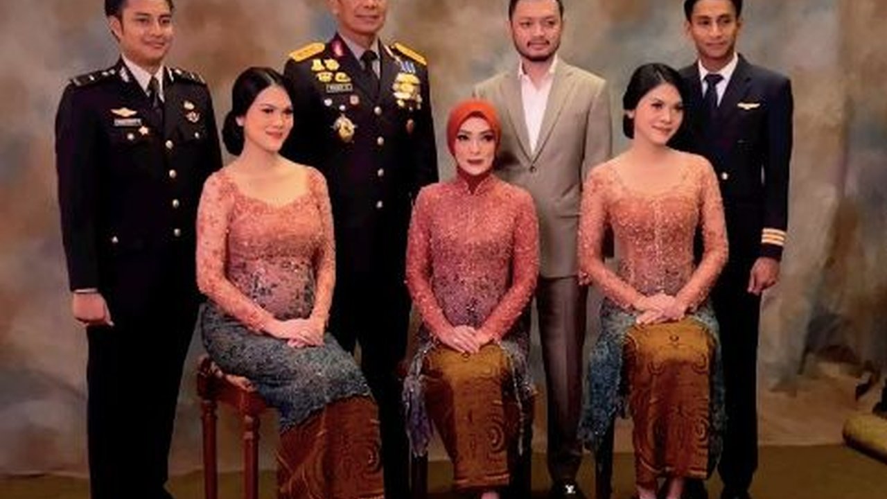 Keluarga Komjen Rudy sedang melakukan sesi foto keluarga. Mereka semua tampak harmonis dengan masing-masing memakai seragam kebanggannya.