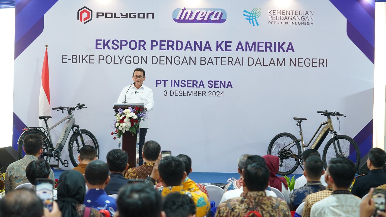 Menteri Perdagangan Budi Santoso melepas ekspor produk sepeda listrik karya anak bangsa ke pasar Amerika dan Eropa pada Selasa, (3/12) di Sidoarjo, Jawa Timur. Ekspor sepeda listrik bermerek Polygon Kalosi tersebut merupakan produksi PT Insera Sena. Nilai ekspor mencapai USD 500 ribu atau setara Rp7,8 miliar.