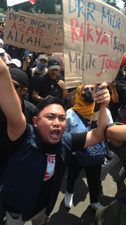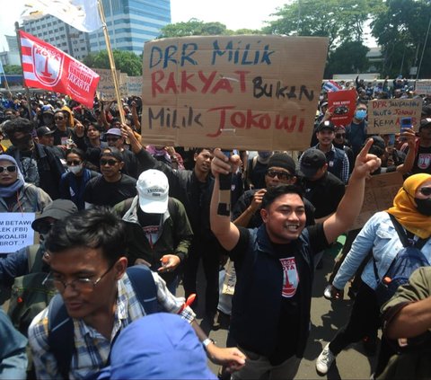 FOTO: Kepung Gedung DPR, Pendemo Bawa Poster Gambar Jokowi Hingga Singgung Oligarki
