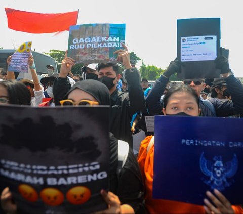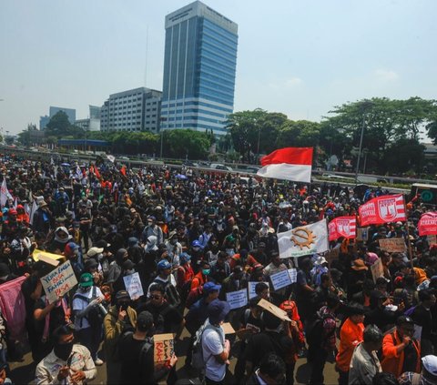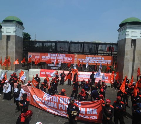 Massa dari Partai Buruh dan berbagai elemen masyarakat berunjuk rasa menolak pengesahan revisi UU Pilkada di depan Gedung DPR/MPR, Jakarta, Kamis (22/8/2024). Dalam aksinya para pendemo membawa berbagai spanduk dan poster untuk menyuarakan keresahan dan kemarahannya. Foto: Merdeka.com/Arie Basuki