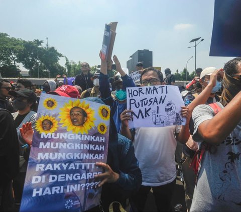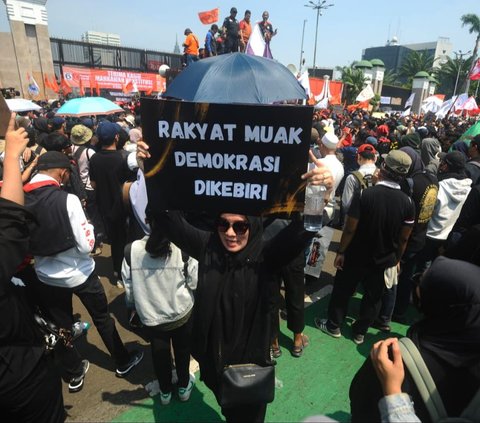"Rakyat muak demokrasi dikebiri," seru pengunjuk rasa dalam sebuah poster yang diangkat tinggi. Foto: Merdeka.com/Arie Basuki