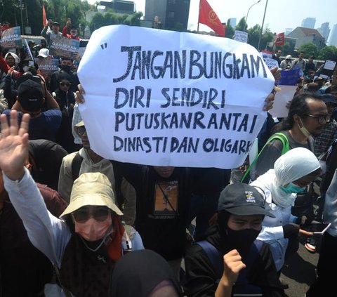 "Jangan bungkap diri sendiri. Putuskan rantai dinasti dan oligarki," tulis pengunjuk rasa pada sebuah poster berwarna putih. Foto: Merdeka.com/Arie Basuki