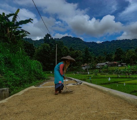 Petani menjemur gabah jenis Baligo di kawasan Sukamakmur, Bogor, Jawa Barat, Sabtu (27/4/2024). Seusai Lebaran, harga beras di tingkat penggilingan saat ini mengalami penurunan cukup signifikan, dari awal bulan puasa seharga Rp12.500 per kilogram kini menjadi Rp10.500 per kilogram. Merdeka.com/Arie Basuki